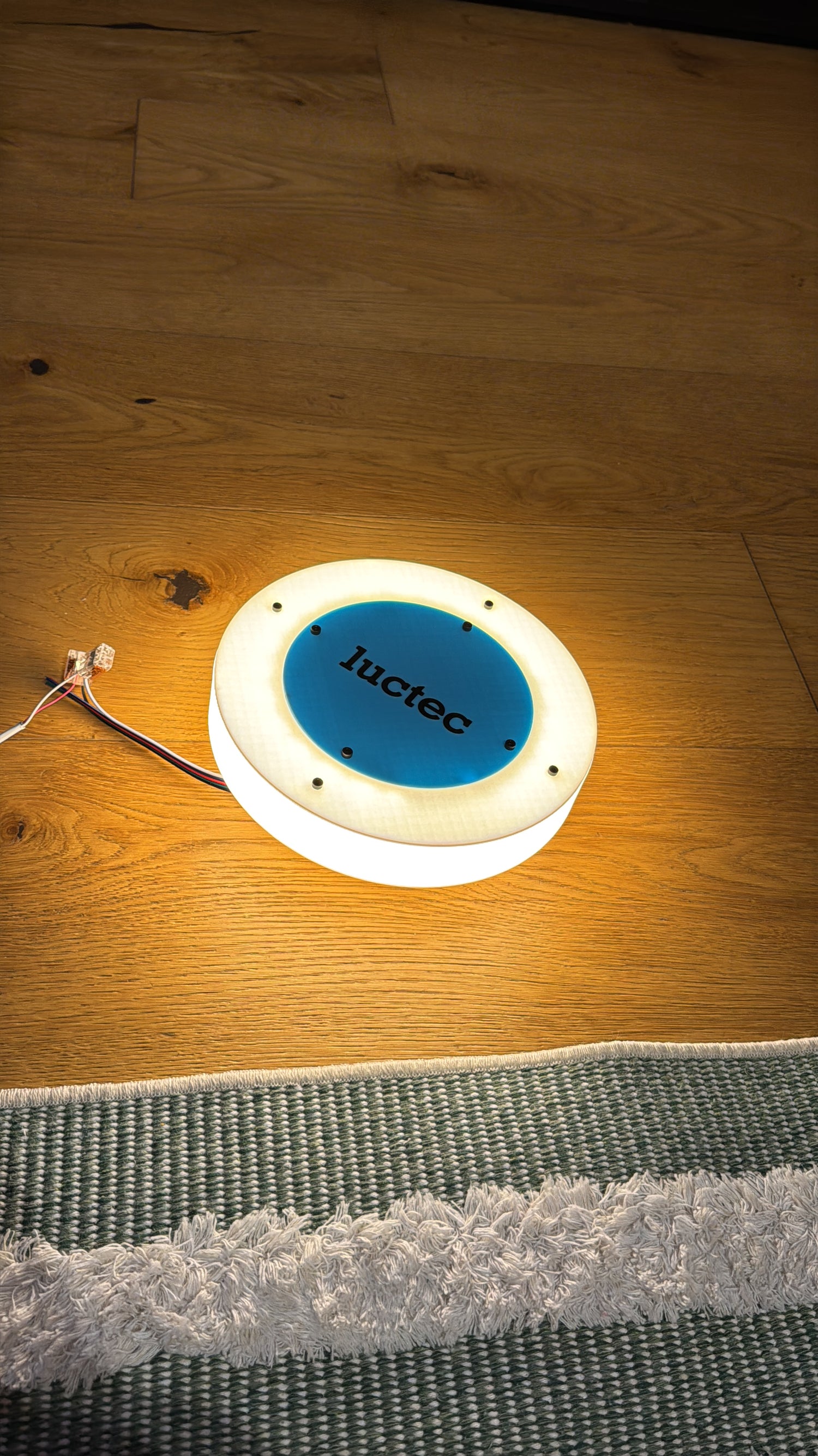 Hier wurde eine Deckenleuchte entwickelt, bei der die blaue Fläche aus fluoreszierendem Material gedruckt wurde.